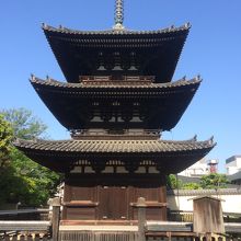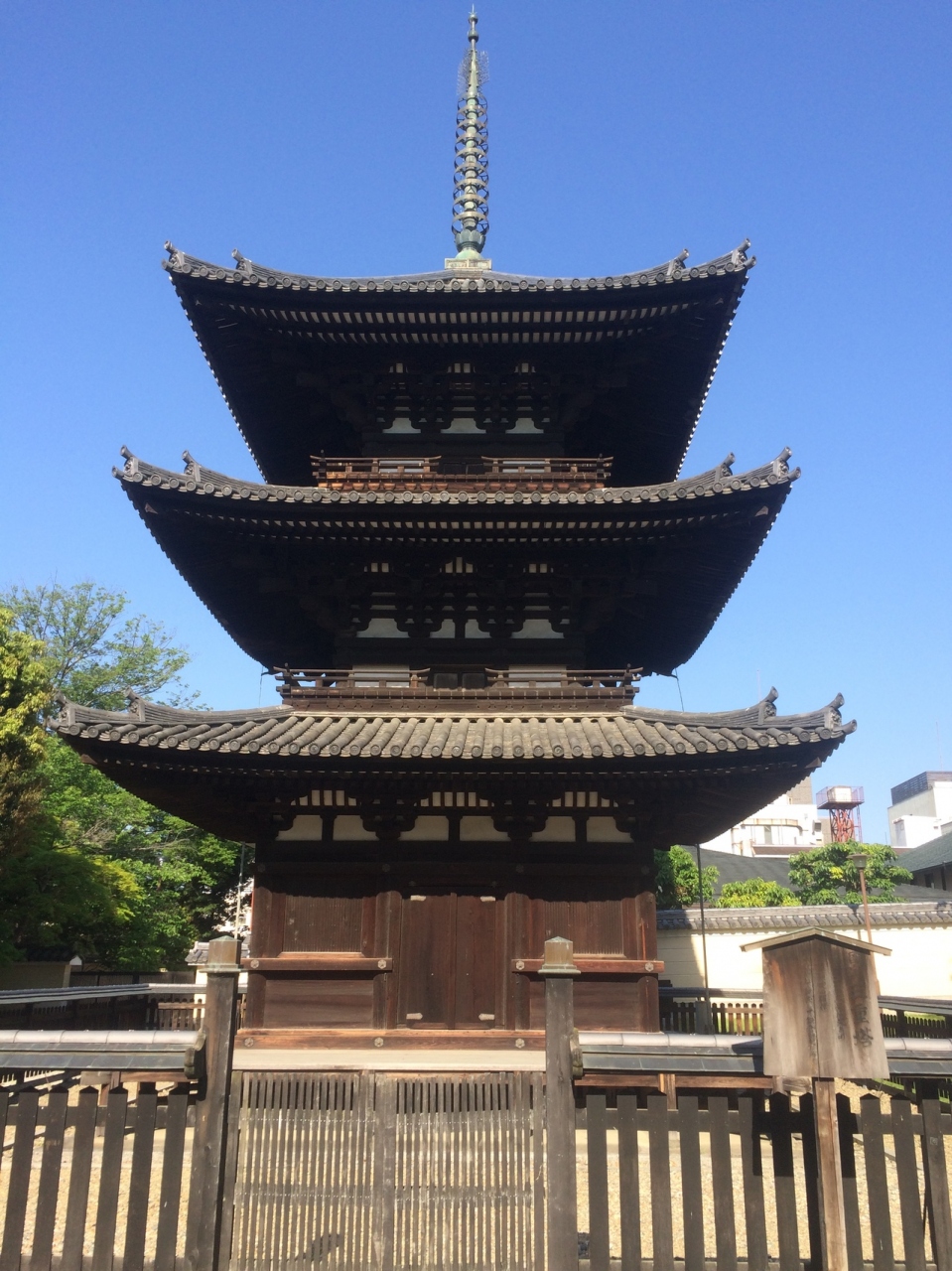 南円堂や北円堂の下にあり目立たない場所にありますが建物が高いため、遠くからでも直ぐにわかりました。建物は茶色っぽい色で、歴史を感じる塔でした。塔の周りをぐるりと囲いで覆い、近くから見学することとなります。
