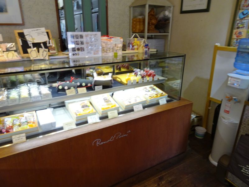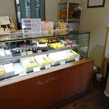 草薙駅前の小さな洋菓子店。外観からまだ新しい店であることが分かります。店内に入ると左側にケーキケース。右側が焼き菓が並べられた棚。小さな店です。
