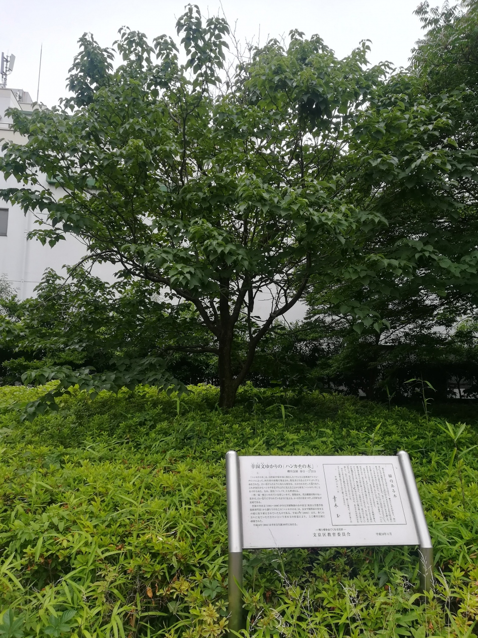 自身も小説家であった幸田露伴の次女の幸田文が小石川植物園から譲り受けたが礫川公園に残っていました。時期によっては、白い花びらのように見える苞があたかもハンカチを広げたように見えるそうですが、訪れた際にはそのような姿ではなく、普通の木に見えました。