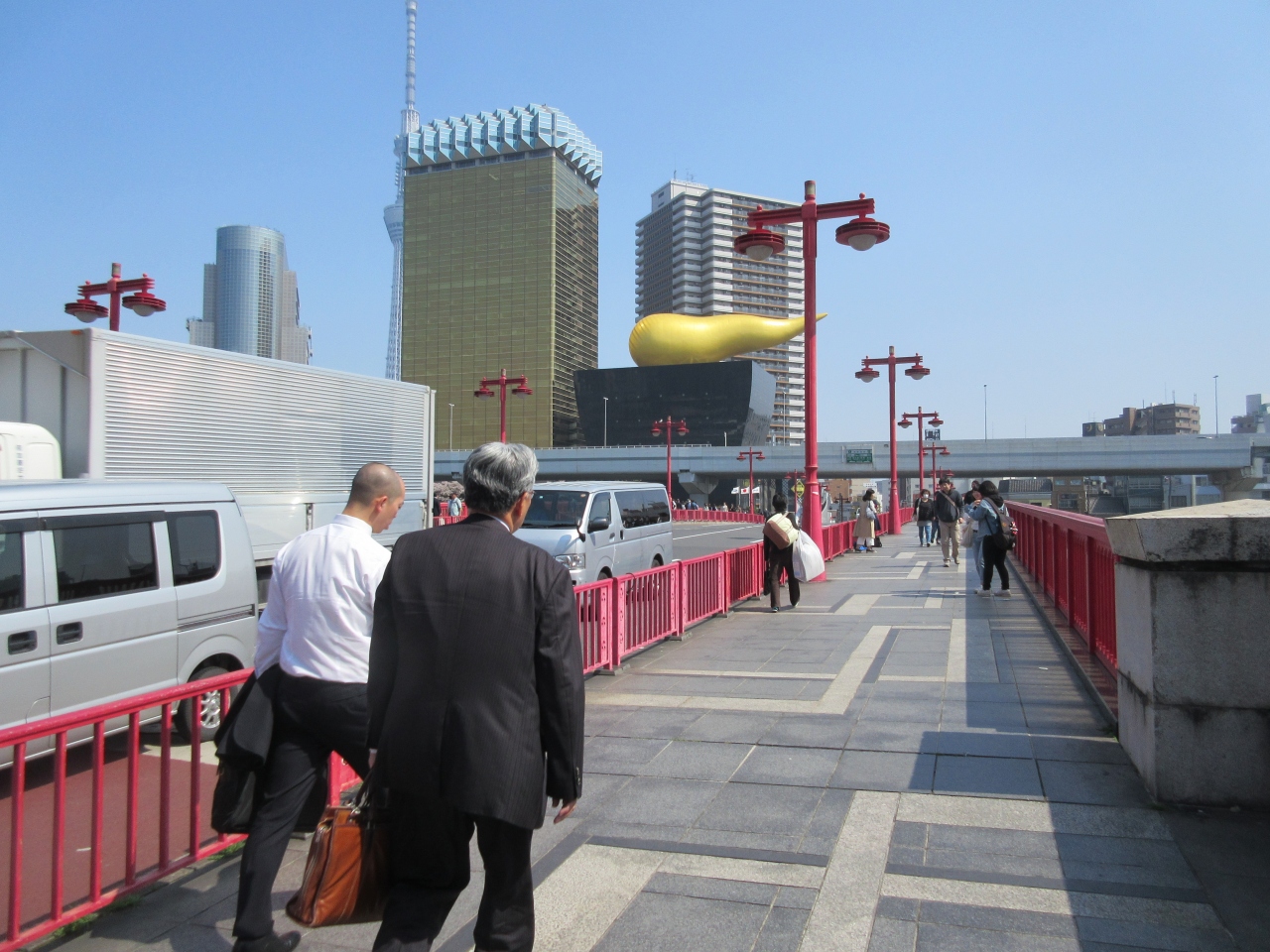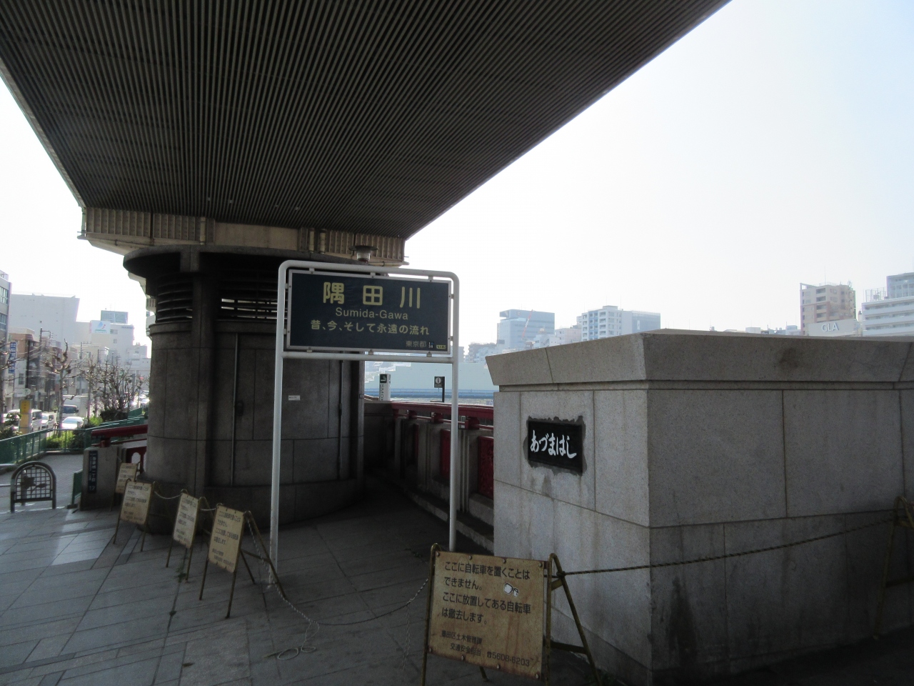 浅草にある吾妻橋は、隅田川にかかる橋で浅草の中心と本所を結んでいます。浅草側は、東京メトロ浅草駅出入口や観光案内所があり、朝から晩まで観光客が絶えません。橋からは、スカイツリー、アサヒビールの黄金色のモニュメント、隅田川の流れの景色が抜群です。写真スポットとして著名。