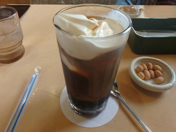 オーダーしたソフトクリームが乗ったコーヒーはコーヒーゼリーが入っていてデザート系ドリンク。氷が混じっているのでゼリーだけ飲めず、食感が悪いのが残念。