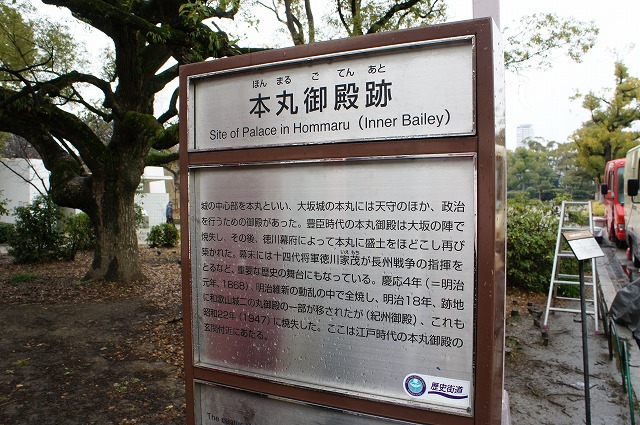 大阪城天守閣の南側に広がる広場が本丸のあった場所です。天守閣に入る人、出てきた人でごった返しています。軍事的な色合いが強い天守閣と違って、本丸は政治や生活の中心。おそらくたくさんの建物があったのでしょう。特に本丸御殿は当時、日本で最も豪華な建物だったようです。ただ江戸城があった皇居東御苑の本丸跡と比べると、あまり広さは感じませんでした。全国レベルの行政府だった江戸城との違いでしょうか。