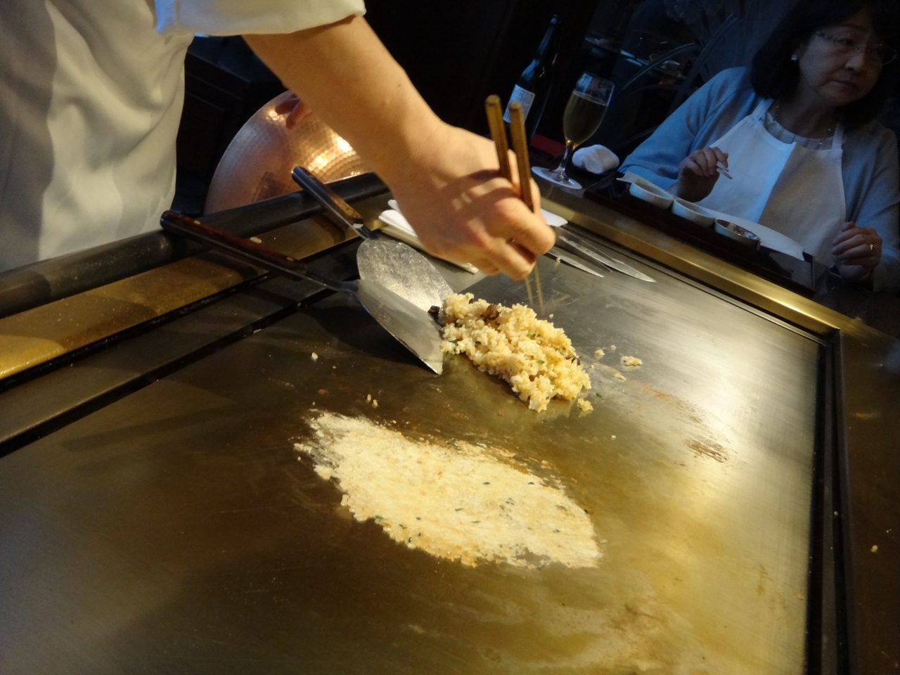 コの字型の6-7名の座席に1つの鉄板とシェフが付きます。