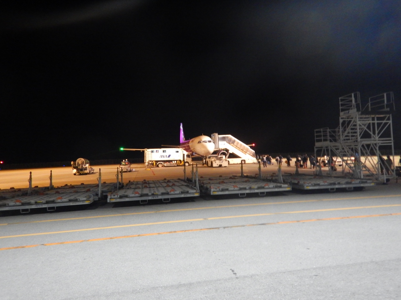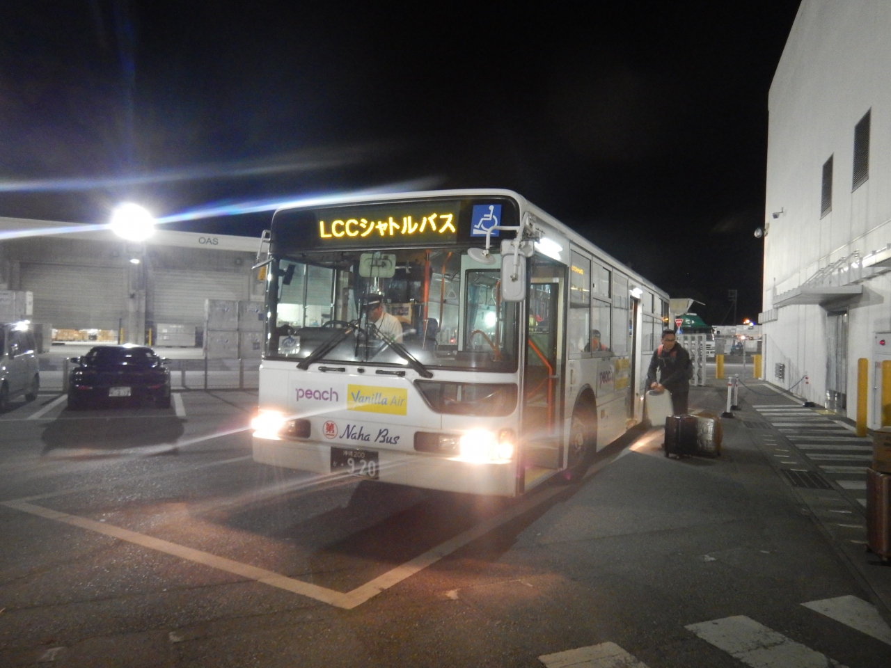 LCCターミナルへは無料のシャトルバスが出ている。行く時はよいが、那覇に到着した時は混雑する。LCCターミナルは貨物倉庫を改造したように感じた。造りは非常に簡素。一応売店はある。出国手続きもこんなところでやるのと驚く。滑走路への扉を開けて、歩いて飛行機に向かった。