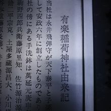 JR の有楽町の駅を出て新橋川の日比谷方面に向かって出て行くと大きな電気ビルがあるのでそちらの線路沿いの敷地にこちらの有楽稲荷がありますがとても小さな神社なので分かりにくいですが正面に立つと赤い立派な鳥居があるのですぐにわかります 綺麗に手入れされている神社ですが江戸時代からの歴史があるそうです