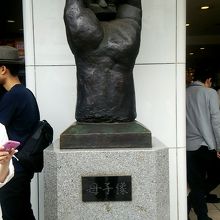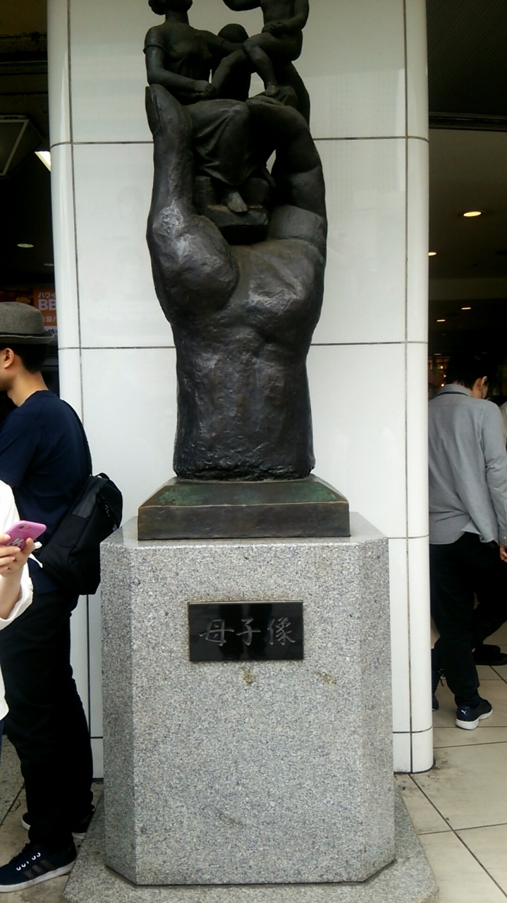 池袋駅には沢山の待ち合わせ場所があります。いけふくろう、モザイクカルチャーそしてここ東口を出てすぐにある母子像です。大きな手のひらの上で母と子供が向かい合っている像です。
