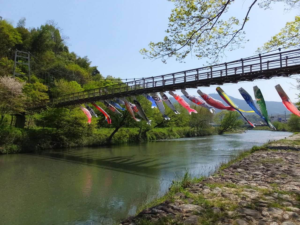 内子の町のはずれにある道の駅「からりフレッシュパーク」にある吊り橋です。訪問時は4月で、名残の桜の花が残り、5月を控えこいのぼりが泳いでいました。川面からはそう高くなく、手すりもがっちりしてますし、橋の歩道も隙間なくしっかりした木の板なのでこわさはないです。見下ろす清流が気持ちいいです。往復するだけですがとても気分がいいです。