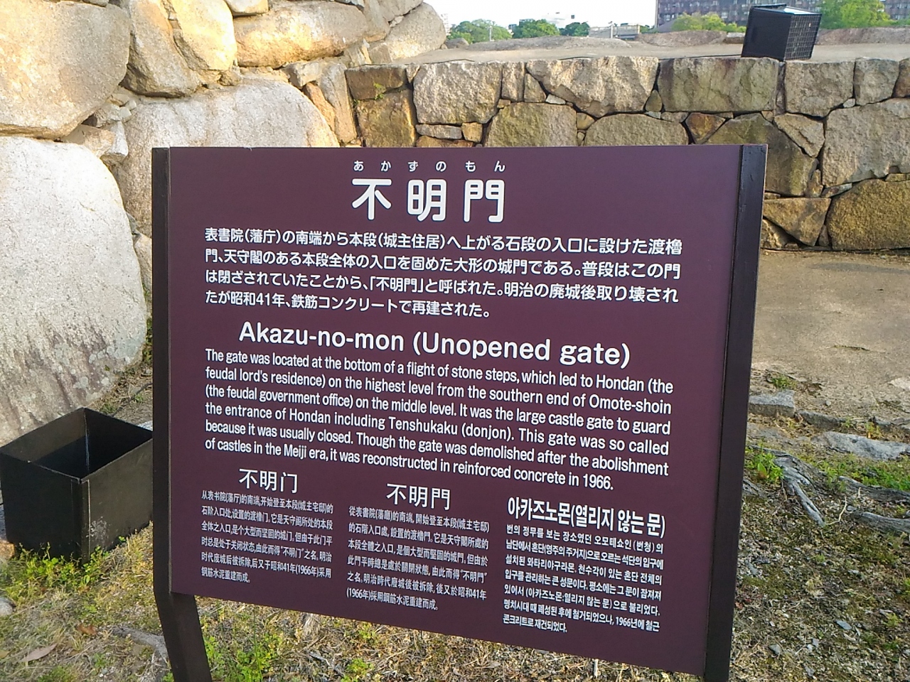 ゴールデンウィーク中に岡山城のを見学しました。その城内に入るときに通る大きな門です。読み方は「あかずのもん」で、当時は北側の門を利用して、こちらの門はほとんど閉ざされてたのでこの名前だと説明板に書いてありました。一度明治時代に壊されたけど昭和に天守とともに建て直されたそうですが、たたずまいはなかなか立派でした。