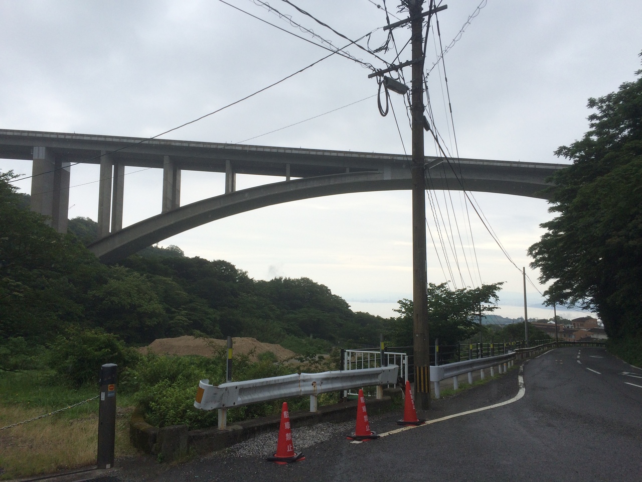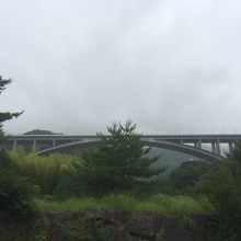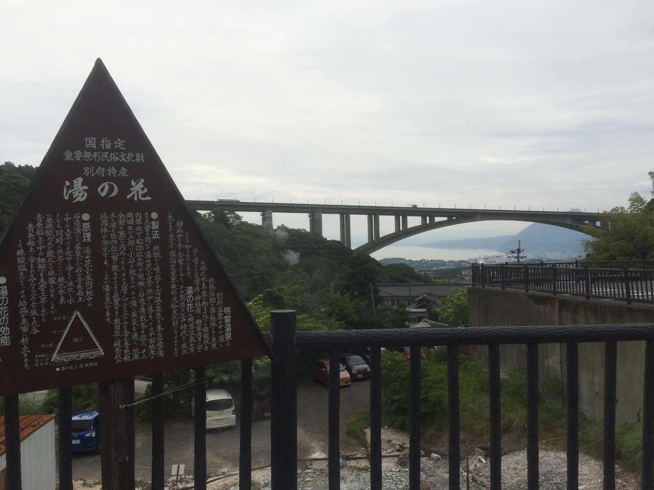至って普通の橋でした。岡本屋売店の展望エリアから見学。左右から中央に連れて下の支えが一直線になっています。後方には別府湾があります。橋をくぐって反対からも上を見て見学しましたが両サイドとも橋は同じ景観でした。