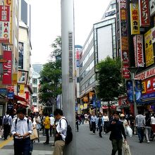 休日はたくさんの人が歩いていて左右にはたくさんのお店があります。