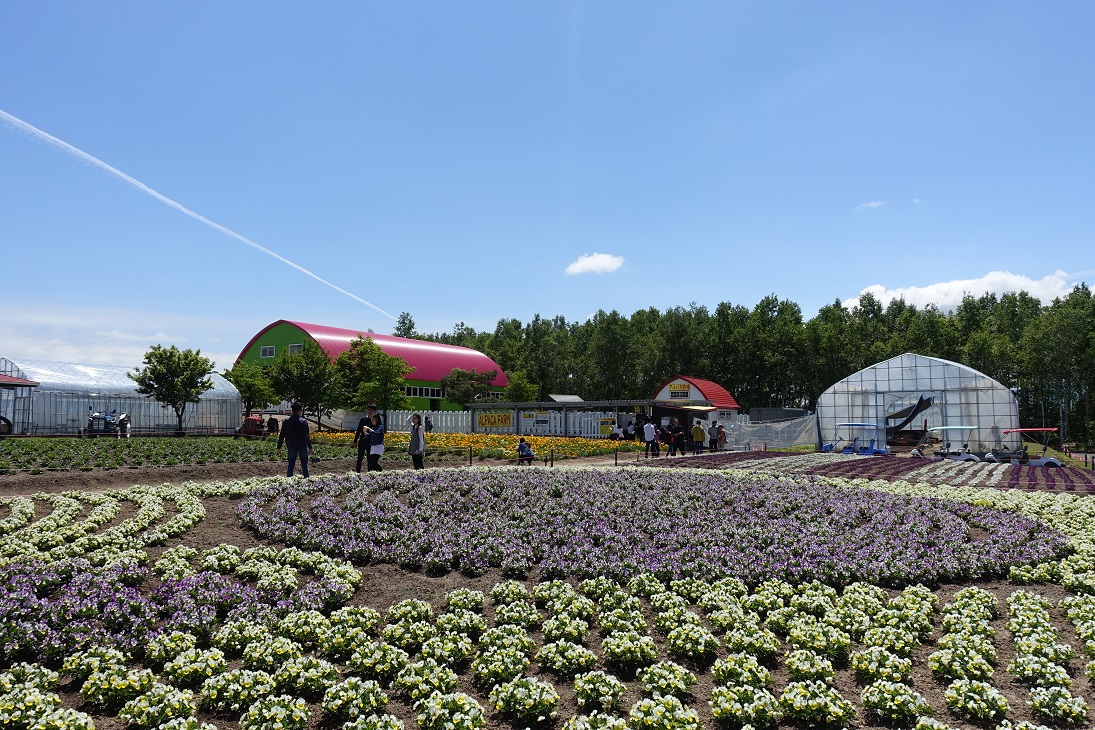 広い丘の斜面に、きれいに区画された花畑が広がっていて、色とりどりの花が咲いています。丘なので坂道が多いのですが、トラクターが引っ張るトラムに乗ってパーク内を回れるようになっています。パークの入口には、お土産屋さんや食堂があります。