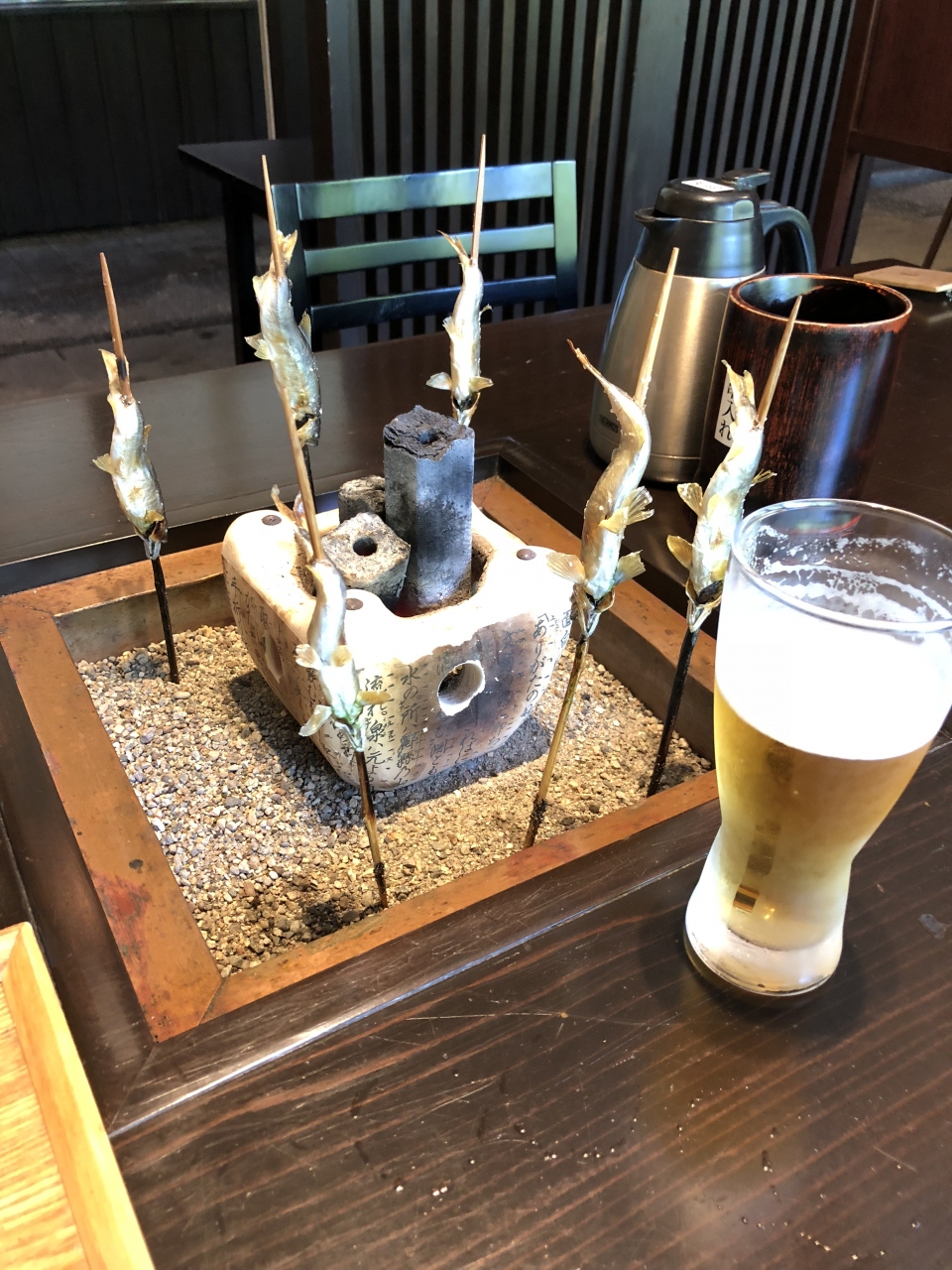 各テーブルには炭火?があり、焼き立てのアユがそこに置かれます。