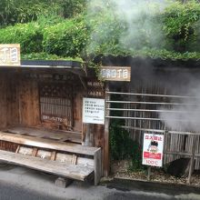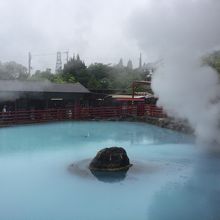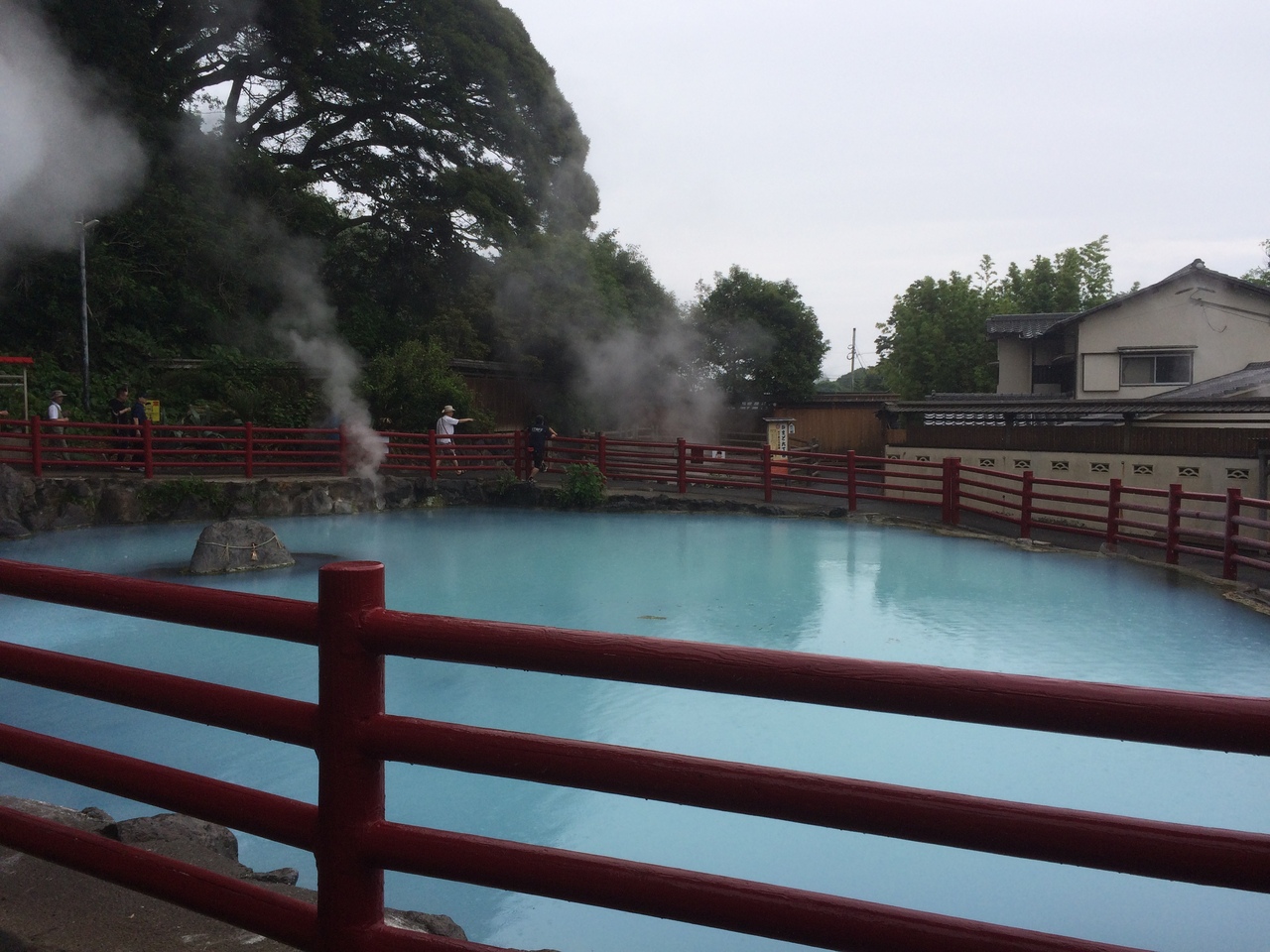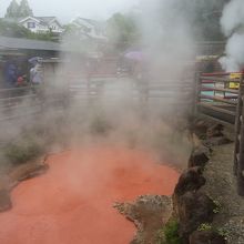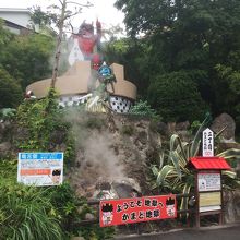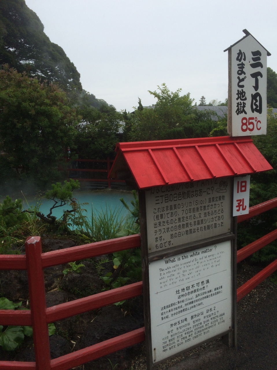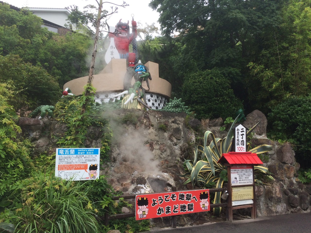鬼の銅像がいくつかあり、地獄何丁目と番地が付いた表札があります。コバルトブールの池から湯煙が上がっていて端の池は赤色で地獄らしい色でした。足湯がある売店の前では、やたらラムネを飲んでいる外国人が多かったです。