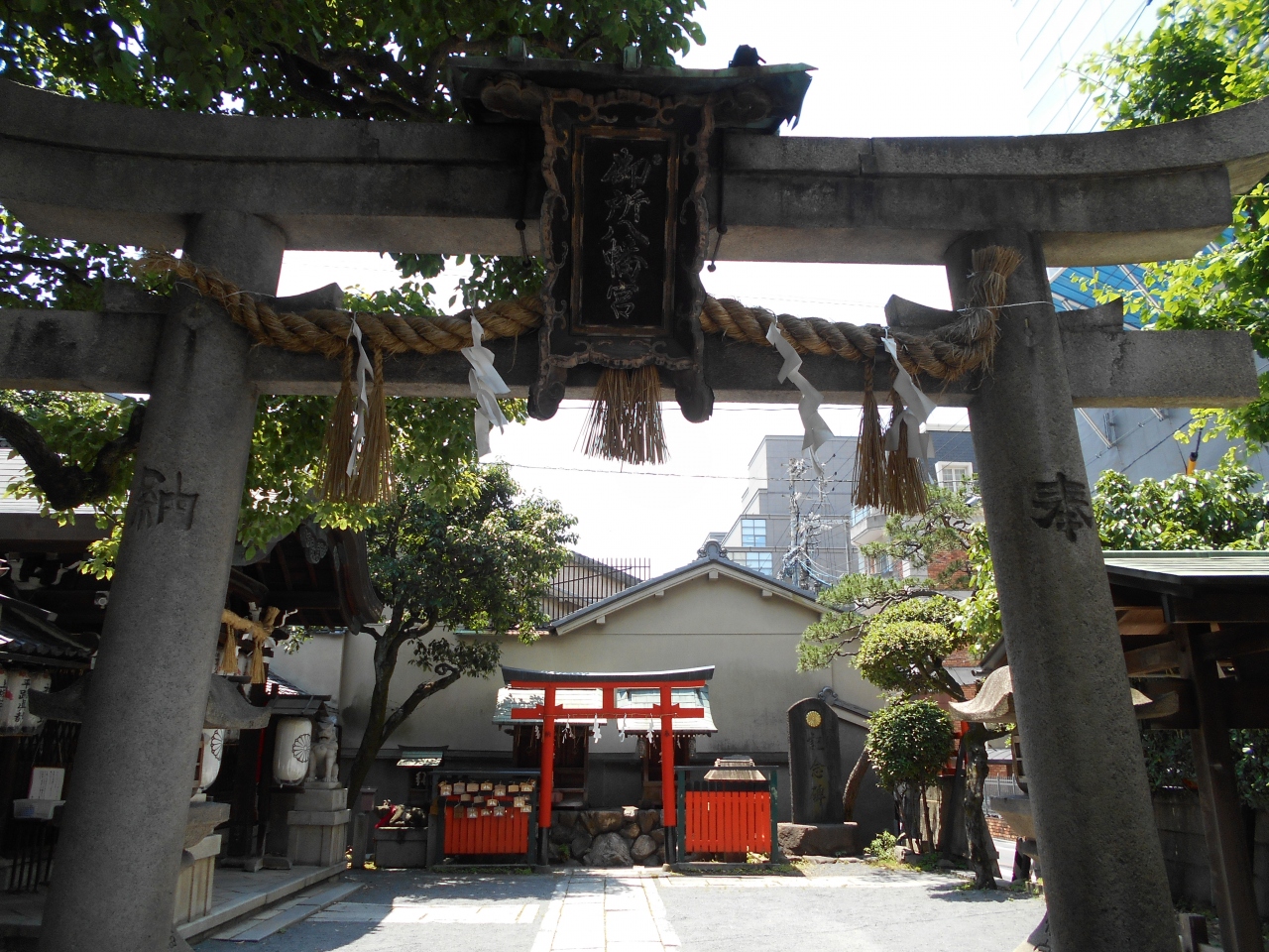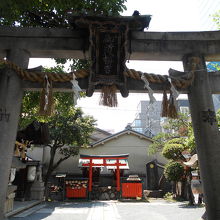御池通に面しています。「御池の八幡さん」などとも呼ばれています。足利尊氏が邸内の守護神として勧請したと伝えられています。安産・幼児の守り神だそうです。小さい神社ですが出入り口が2か所あり、斜めに横切って通り抜けていくだけの人の姿も見ました。
