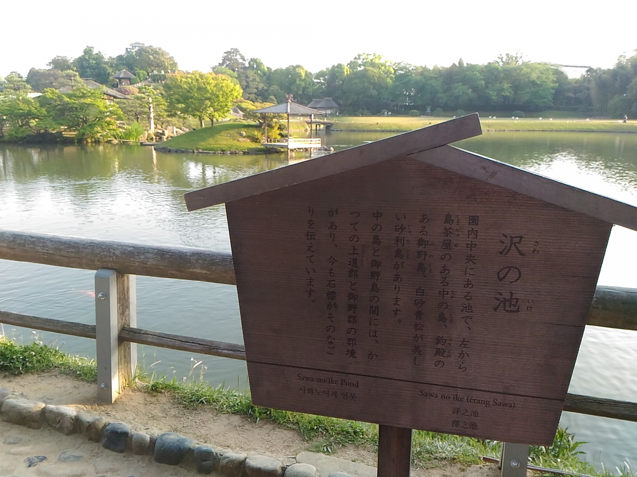 ゴールデンウィーク中に岡山後楽園に行きましたが、その園内の中央付近に広がる大きな池です。池の中には島がいくつかあり、松の木が植わっていたりきれいな砂利が敷いてあったりと、とても趣があって、日本庭園らしさが感じられてとてもよかったです。