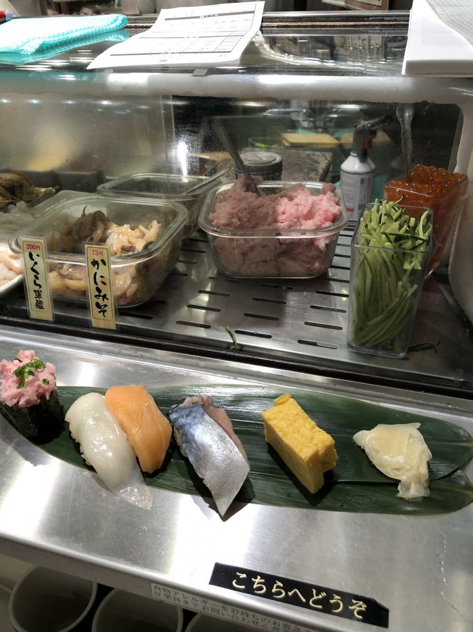 新幹線の待ち時間を利用して、品川駅構内にある寿司店・魚がし日本一でお寿司をいただきました。夕方限定のチョイ飲みセットが有ったので迷わず注文。サーモン・サバ・イカ・ネギトロ軍艦がそれぞれ一貫。卵焼きが2切と生ビールが付いてちょっとつまむには丁度いい量です。時間的にも10分程の滞在で気軽に食べることが出来ました。