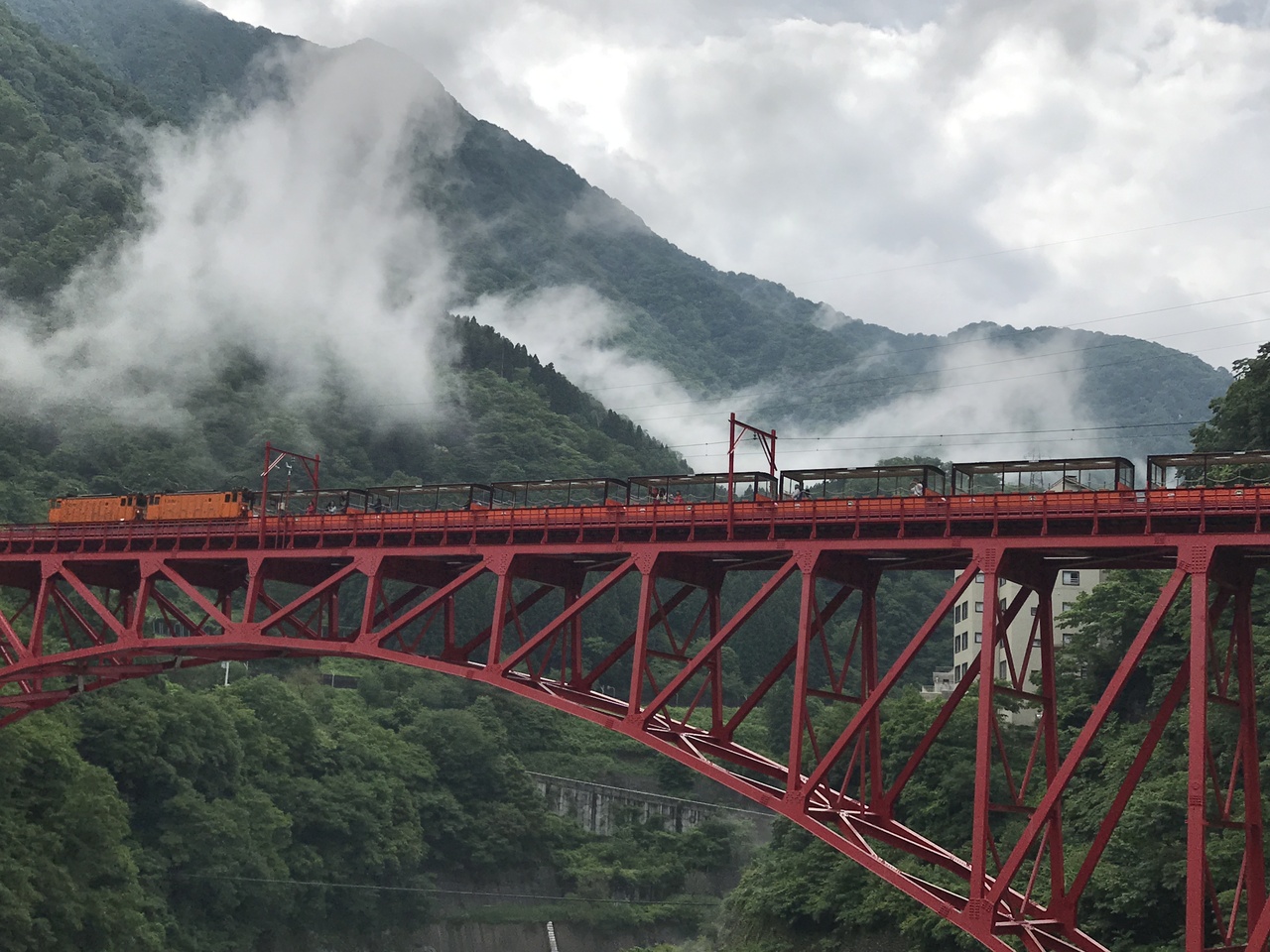 黒部渓谷の新緑や黒部川のグリーンに映える赤い橋で、