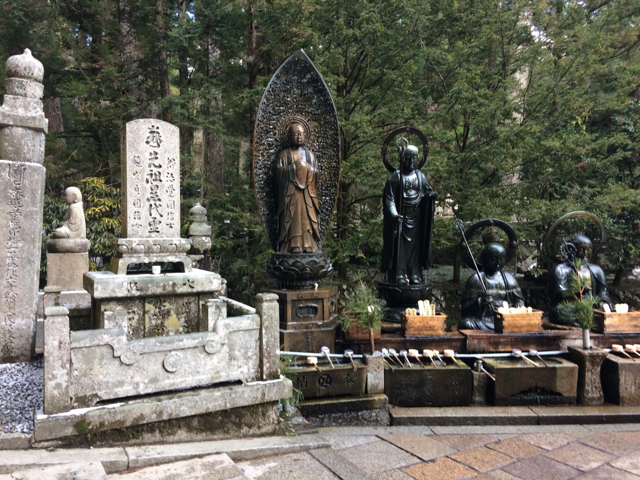 高野山の奥の院の入口に生死の境でもある玉川という小川が流れていましたが、その川を背にしてお地蔵さんがたくさん並んでおり、参拝者の中にはこれらのお地蔵さんに一つ一つ丁寧に水をかけていました。 亡くなられた親族の供養を兼ねて水をかけている方が多いようでした。