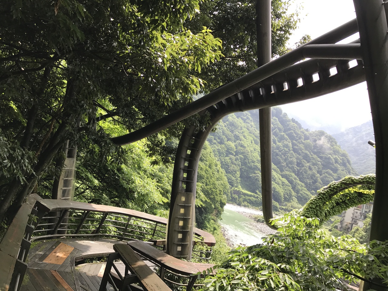 想影橋を渡っていると、新緑の間にくねくねしたパイプが見えてきます。