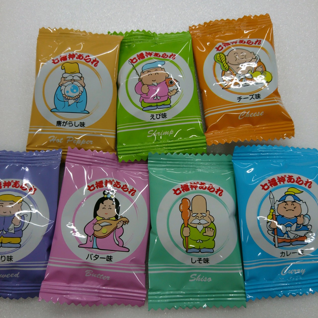 七福神あられを購入いたしました。7種類の味が異なり小袋に入っております。それぞれに、七福神が一種類ずつ描かれたパッケージでした。あられの他にも七福神煎餅や銀座七福神など縁起のよさそうなアイテムが揃っておりました。