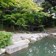 花菖蒲の咲いている方へと向かう途中に仮設の橋があり、大泉水とは反対側に「白糸の滝」があるようでしたが、囲いの前に「白糸の滝 修復工事のお知らせ」がありました。工事期間は平成30年1月上旬から6月下旬と書かれていましたが、「6月下旬」の部分は修正された跡がありました。滝があれば、涼しげな雰囲気が醸し出されそうでしたが、見れなくて残念でした。