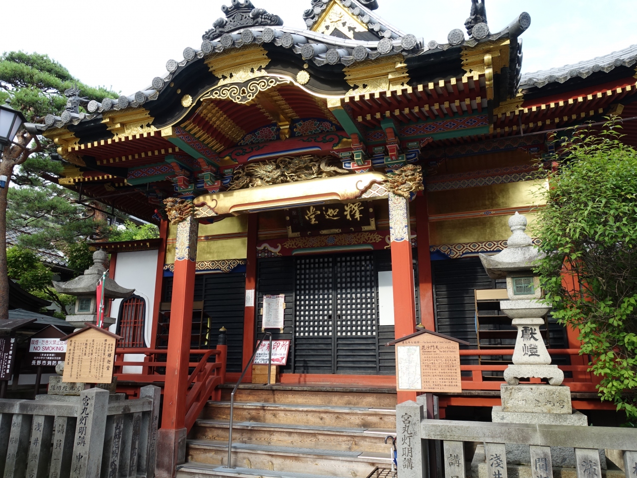 善光寺の仁王門をくぐると仲見世になりますが、一本裏手にあるのが「善光寺 釈迦堂」です。善光寺近辺にあるお寺の中で、ひと際煌びやかな外観を有しています。