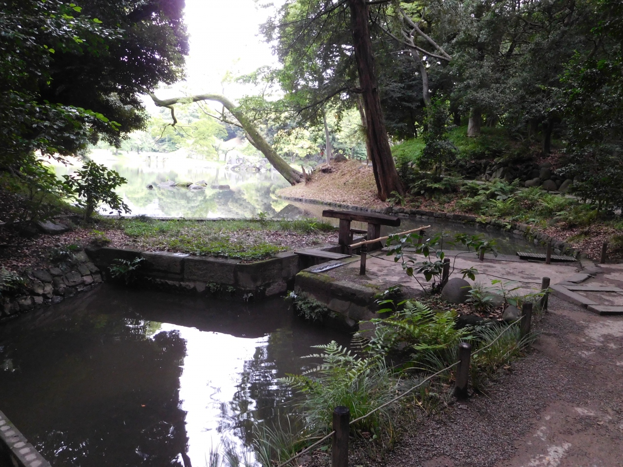 小石川後楽園内、内庭から大泉水に向けて歩いて行くと、池の端の方に、岩がいくつか固まっている場所があり、それが「竹生島」であるようでした。付近には説明板が特に見当たらず、園内の地図を見てこれがそうなのかな?と思いました。島と呼ぶにはちょっと寂しい感じがしました。