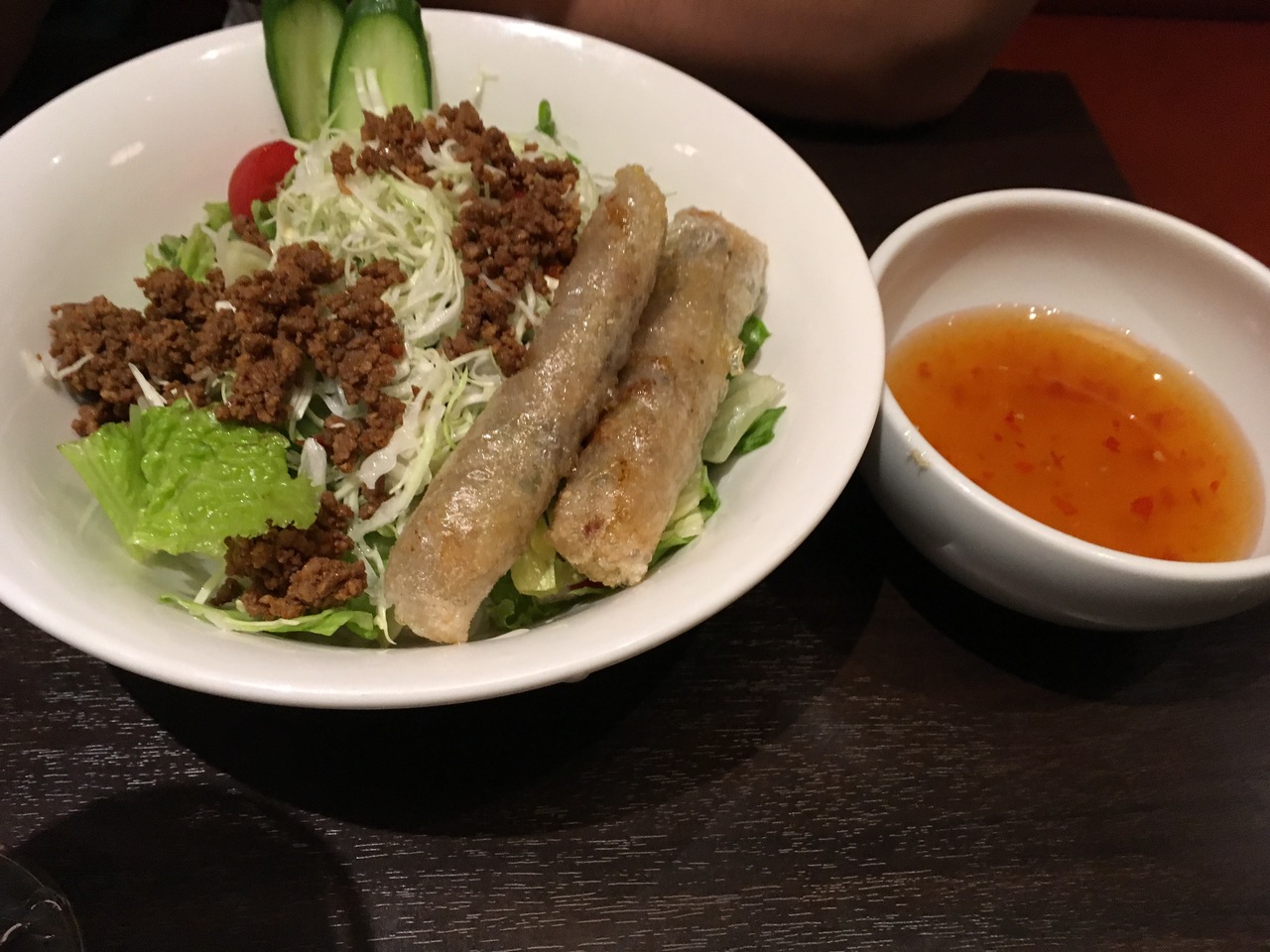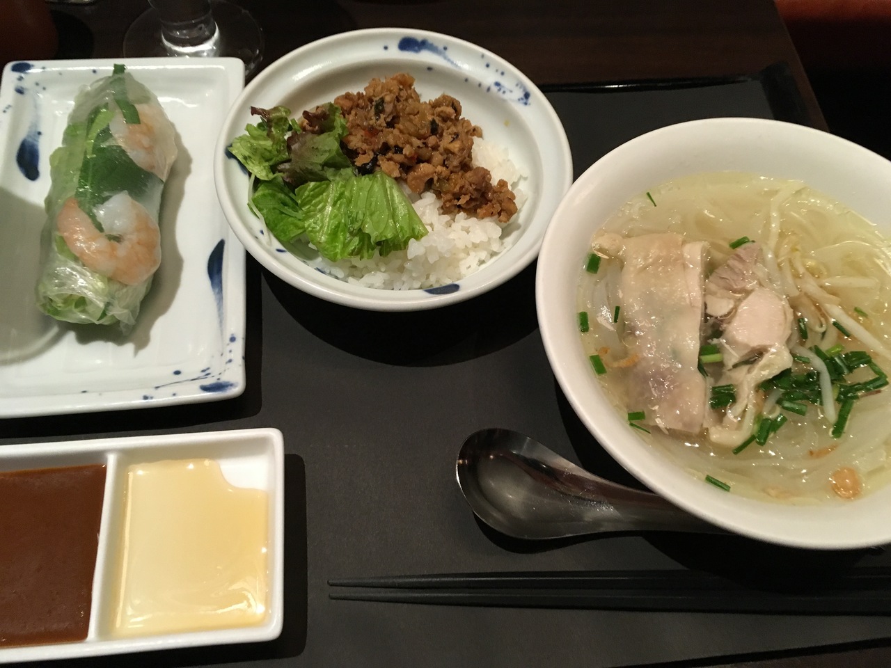 鶏肉のフォーの夜定食とベトナムの汁なし麺を注文しました。フォーの夜定食にはミニガパオライスと生春巻き一本が付いてます。フォーは薄味で優しい味で食べやすく、汁なし麺はスイートチリソースを掛けて美味しくいただきました。