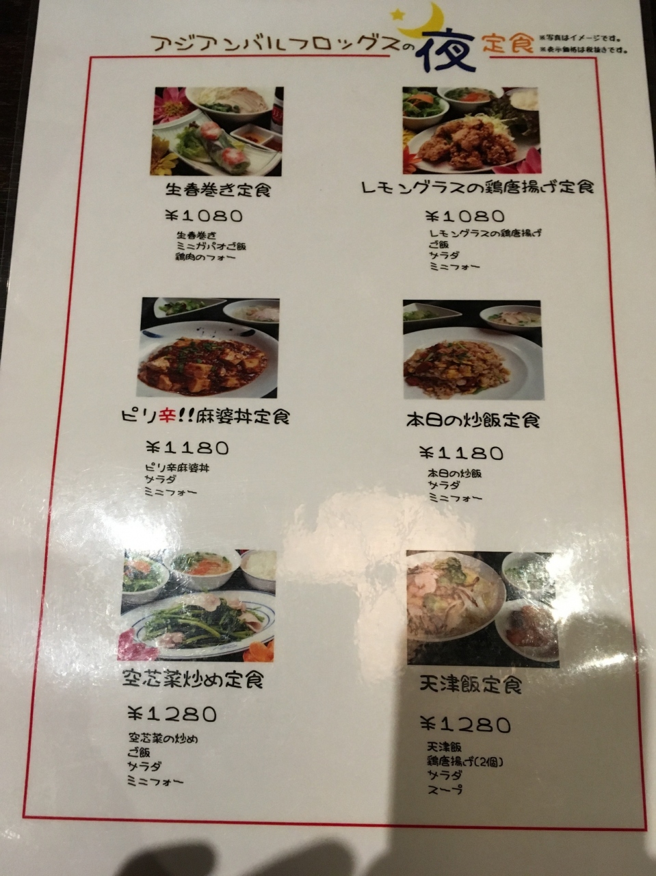 ベトナム料理やタイ料理などが主なお店です。夜定食があり、夜定食には麻婆豆腐がありました。
