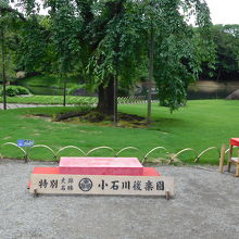 小石川後楽園の出入口となる西門から入って進んでいくと、大泉水のすぐ手前側に、推定樹齢約60年の大きな枝重桜があります。今の時期は青々とした姿でしたが、ちょうど桜の木と大泉水を背景に記念写真が取れるように、日本庭園らしい撮影スポットが出来ていました。きちんと庭園の名前も入るので、桜の時期でなくても思い出に残る写真が撮れる場所になっていて良かったです。
