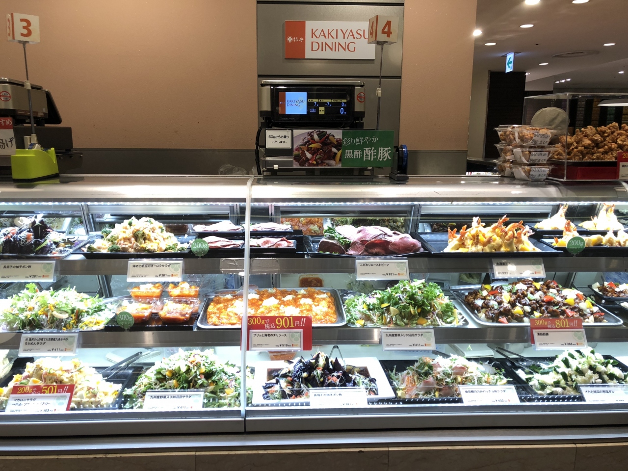 ここにkakiyasu diningのお店が入っています。このお店はお惣菜やさんの中でも、食材の組み合わせが美味しそうなだけでなく、実際にお味もいいと思います。柿安だからローストビーフがもしかしたら一番いいのかもしれないけれど、いっつもサラダ系ばかりで、ローストビーフはまだ手を出したことがありません。