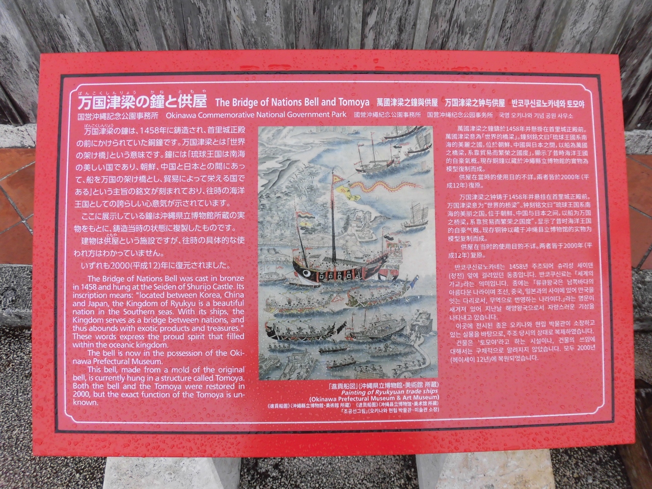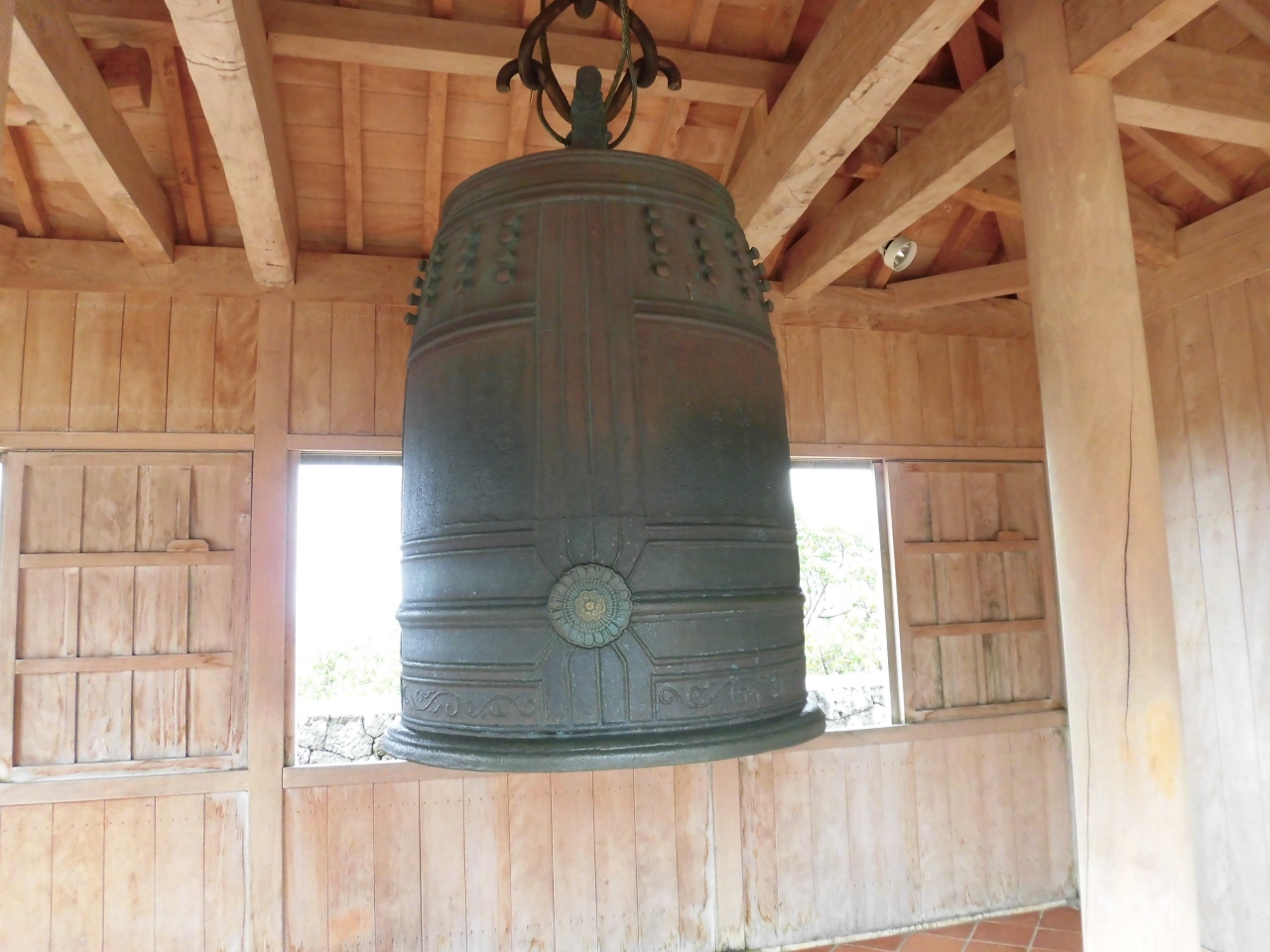 ここにある釣り鐘は、沖縄県立博物館に収蔵されている「万国津梁の鐘」のレプリカです。鐘には「琉球国は南海の美しい国であり、朝鮮、中国、日本との間にあって、船を万国の架け橋とし、貿易によって栄える国である。」という主旨の銘文が刻まれているそうです。琉球王国の意気込みが素晴らしいですね。