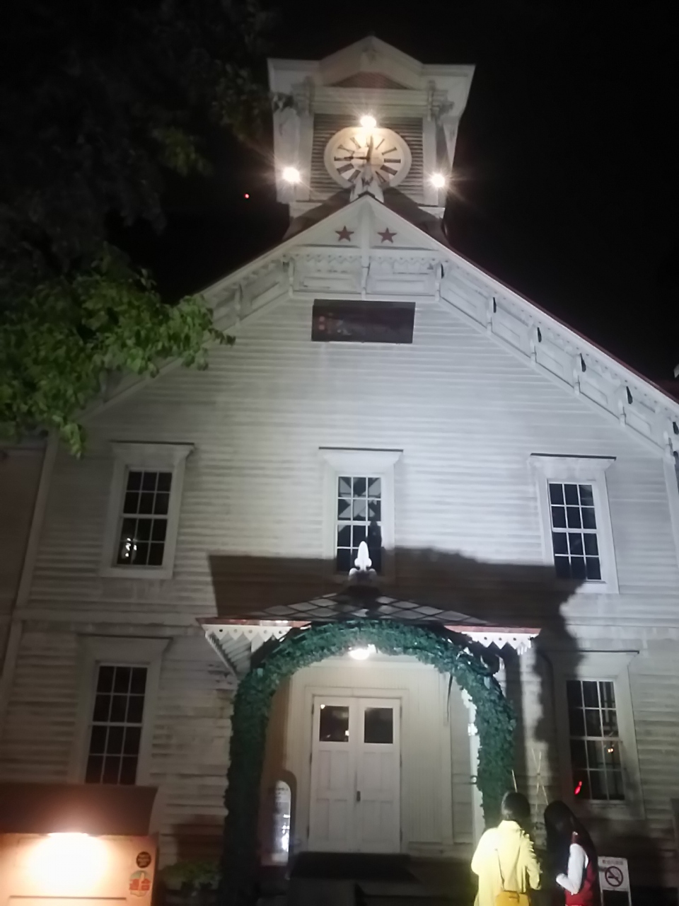 日中に眺める三角屋根の時計台も綺麗ですが、周囲の高層ビル群が気にならない夜景もお