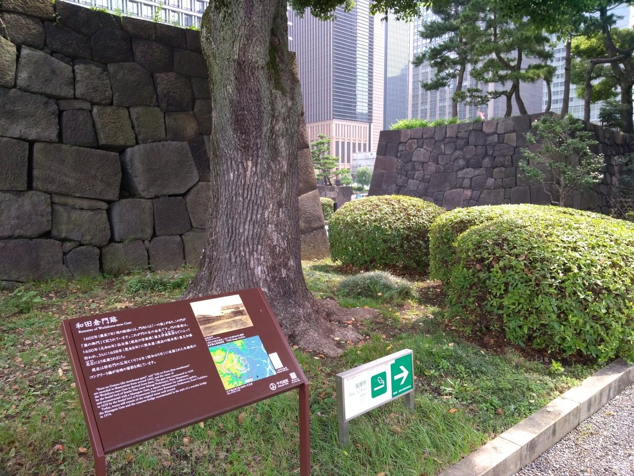和田倉門跡は、和田倉噴水公園内に、添付写真のように、しっかりと掲示板があるので、どこかすぐに分かると思います。門自体はないですが良く出来た石垣が、大手町方面の高層ビル群と最高の景色を提供してくれます。