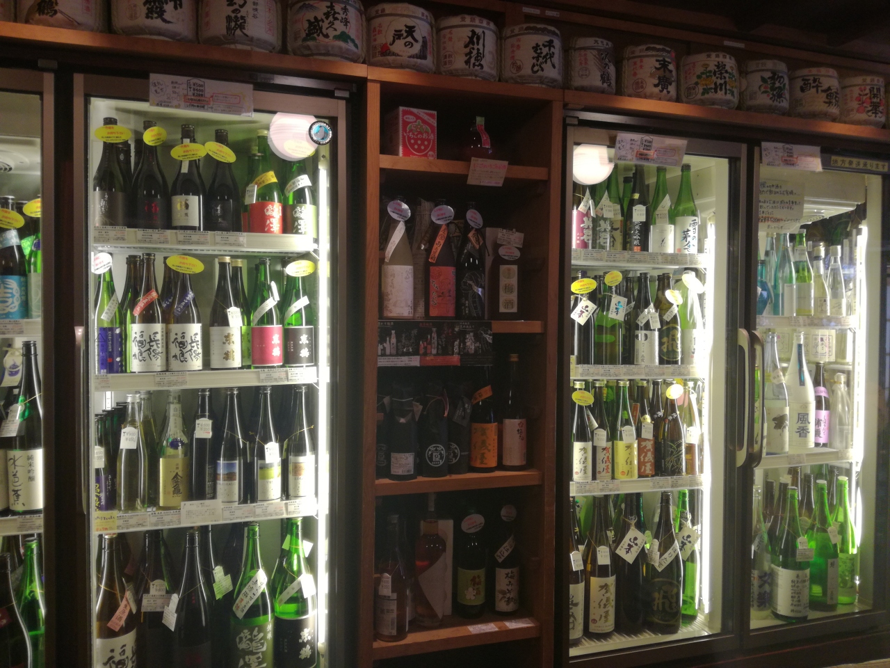 最近角打ちは増えていますが、その中でも特に入りやすい雰囲気です。冷蔵庫にズラーっと一升瓶が並べられており、好きなボトルを持ってレジにいくと、おちょこに注いでくれるので、そのときに支払をします。軽いつまみやおでんもありました。バンコクなど海外2か所にも支店があるらしく、英語の説明書きもあるので、海外の方を連れていくと喜ばれそうです。