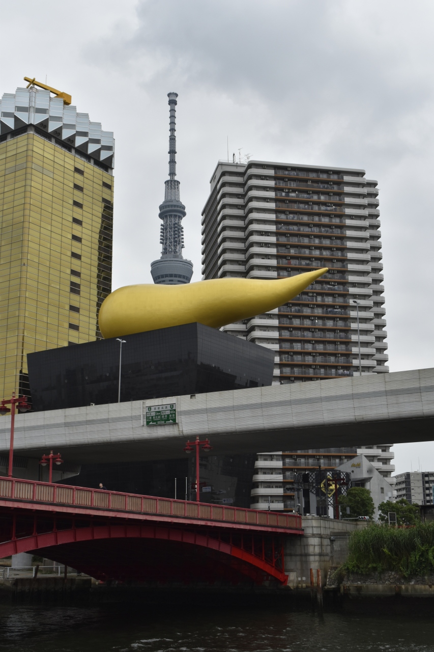 吾妻橋付近に来るとどうしても目に入ってしまうのがこの建物というかオブジェ。奇抜な建物で、是とするか、非とするかはその人の感性次第。世界中でこの種の奇抜な建物が容認されることで、日本は建築家の天国らしい。今回は、水上バスで浜離宮から浅草に移動したので、川からこの建物を眺めることになりました。