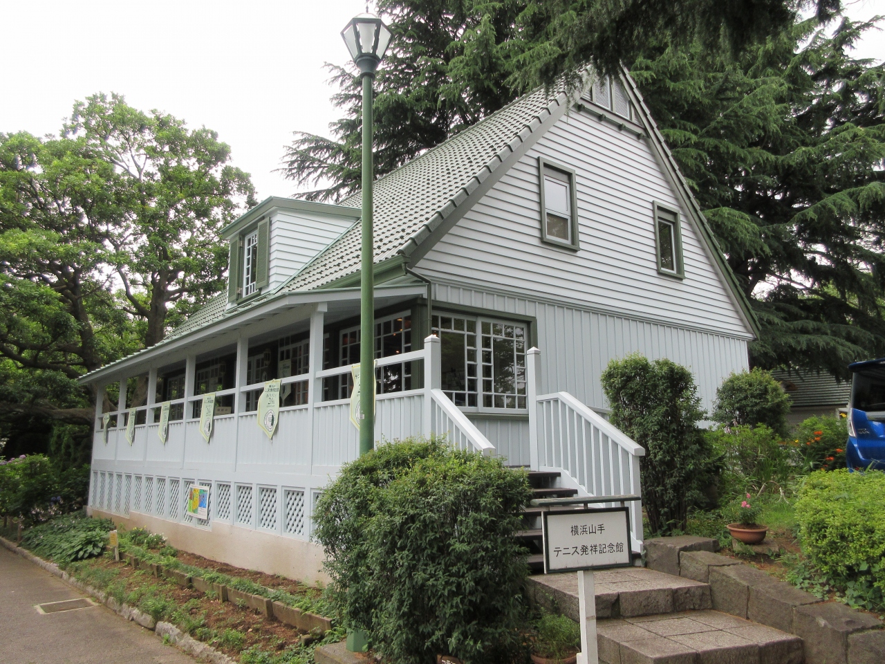 JR根岸線・石川町駅南口から12分ほどの山手公園内に建つ、モスグリーン色の建物です。館内には、19世紀後半に初めてテニスが行われた頃のラケットや、その当時の衣装などが展示されている他、テニスの歴史なども写真を交え掲示されています。子供のころに見た、ラケットが歪まないための木製のプレスも展示されていて、とても懐かしく感じました。外国人女性がテニスをしている様子を浮世絵にしたものを、ステンドグラスにしたものも展示されていました。テニスに興味がなくても面白い記念館だと思います。近くには日本庭球発祥之地と刻まれた碑や、日本最初の芝コートで練習する様子も見ることができました。