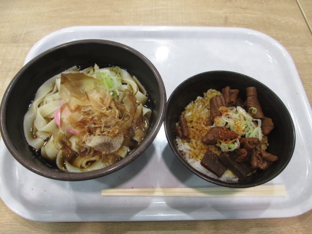 フードコートにあるセルフタイプのお店で、みそ串カツ・手羽先・どて煮・みそかつなどの名古屋飯があります。今回は「500円ワンコインランチ」を注文。「どて丼&きし麺」のセットで、どて煮の「甘味噌」と、きし麺の「かつお出汁」が、いい感じでマッチしていました。