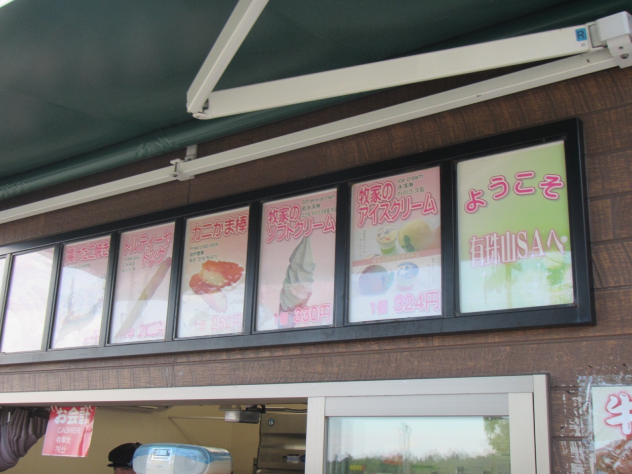 時間帯によっては、屋外のスタンド(ログハウス)も営業していて、ここでは牧家のソフトクリーム(またはアイスクリーム)やタコ焼きがおススメかな?