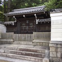 二位の尼に抱かれてる入水した安徳天皇を祀っている場所です。赤間神宮を参詣した後に、石段を下って帰ろうとしたら、看板があったので、右に曲がって行ってみました。天皇家の菊の御紋があしらわれた小さいながらも立派な門がありました。中には入ることが出来ません。