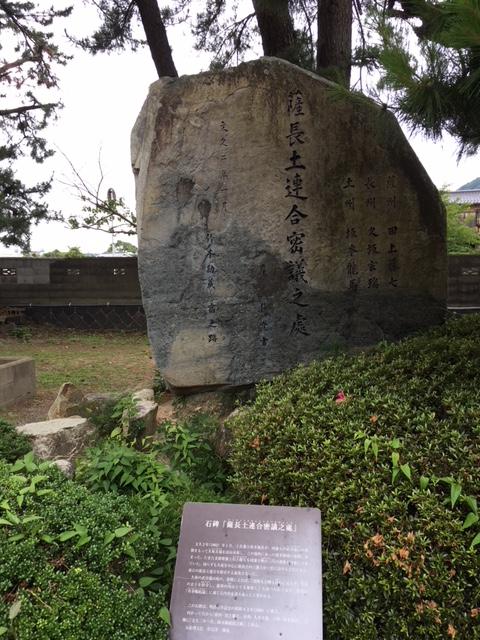 松陰神社の入り口のすぐ左側のトイレの近くにこの石碑が建っています。松陰神社を参詣し終わって、伊藤博文の旧宅へ行く前にトイレに立ち寄ったので見つけることが出来ましたが、そうでなければ気がつくことはなかったでしょう。久坂玄瑞や坂本龍馬の名前が刻まれています。