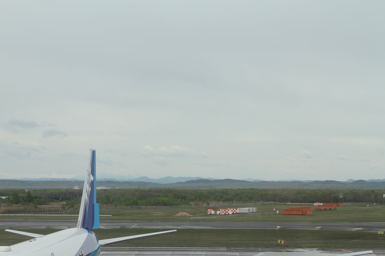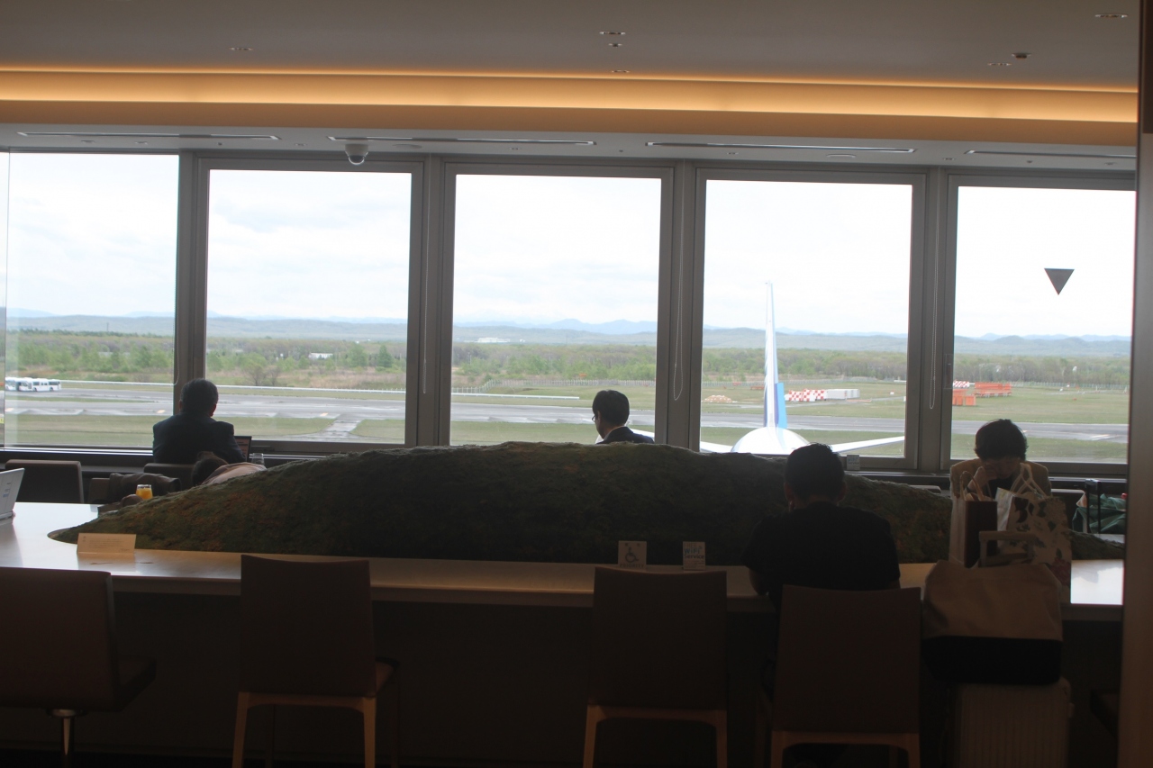 機体が駐機する滑走路側に面した全面ガラス張りの大きな窓からは、北海道らしい雄大な景色や離・着陸する航空機を眺めることができます。
