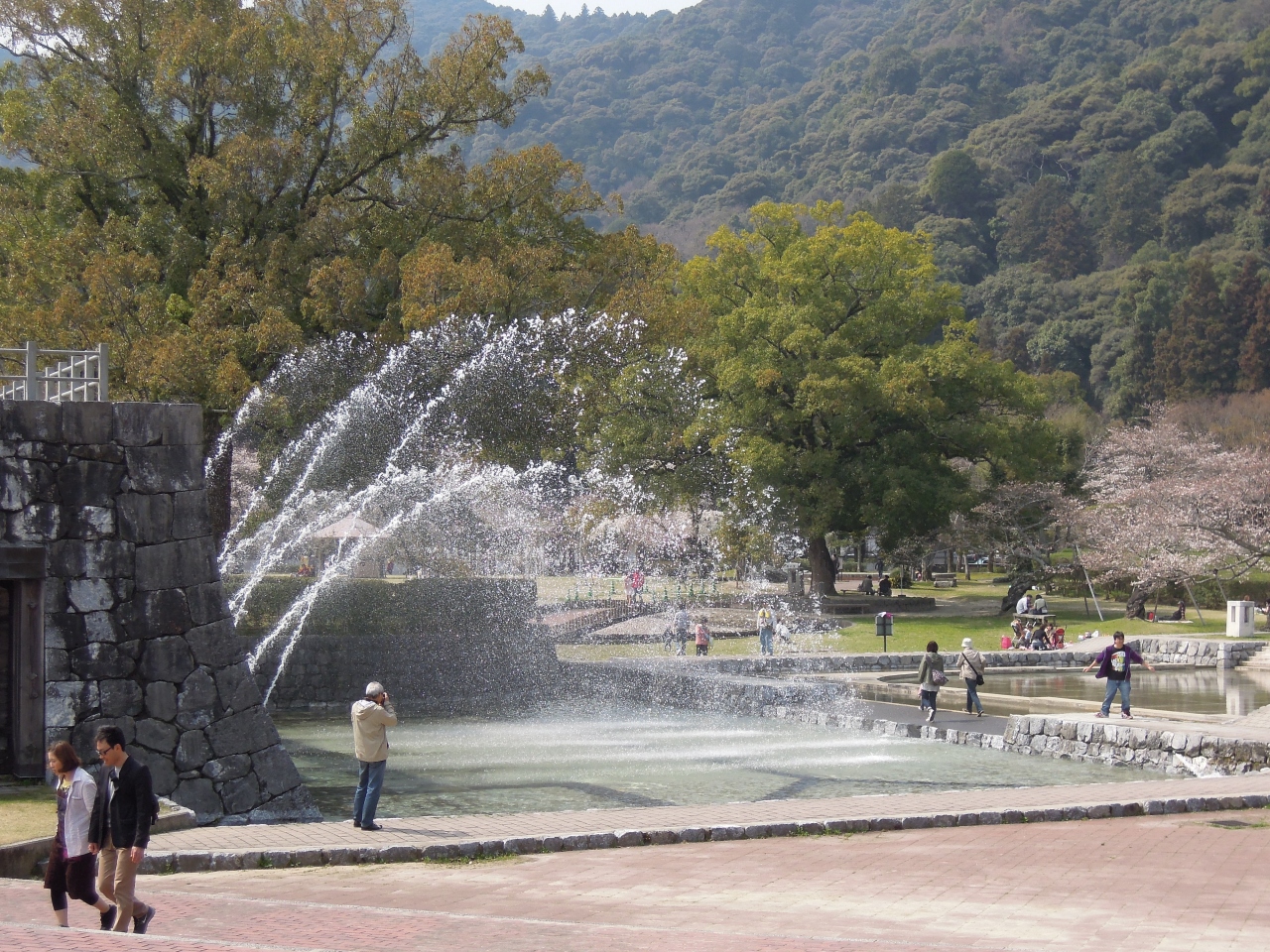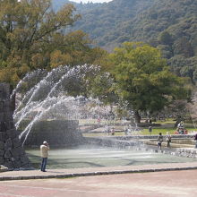 錦帯橋を渡ると目の前に公園が広がっています。旧岩国藩主吉川家の居館跡です。広い園内には香川家長屋門、旧目加田家住宅など昔の建物がまだそのまま残っていて、城下町の風情が残っていました。噴水もあって、涼しげでした。