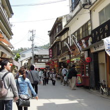 清盛通りとも呼ばれる土産屋や民芸品店などが立ち並ぶ商店街です。たくさんの観光客で賑わっていました。もみじまんじゅうはもちろん、牡蠣や穴子を使ったB級グルメがたくさんあります。食べ歩きするのがとても楽しいです。