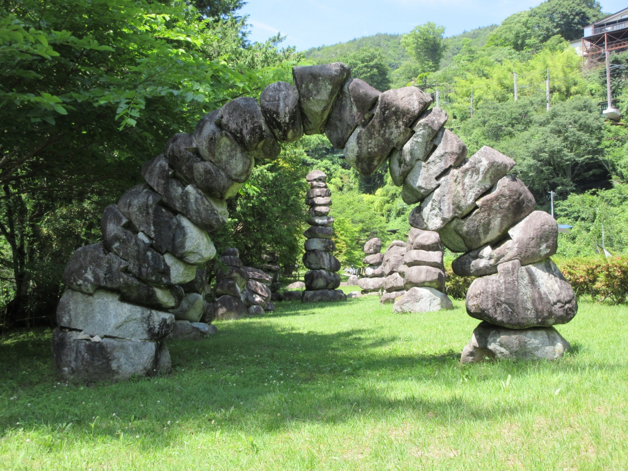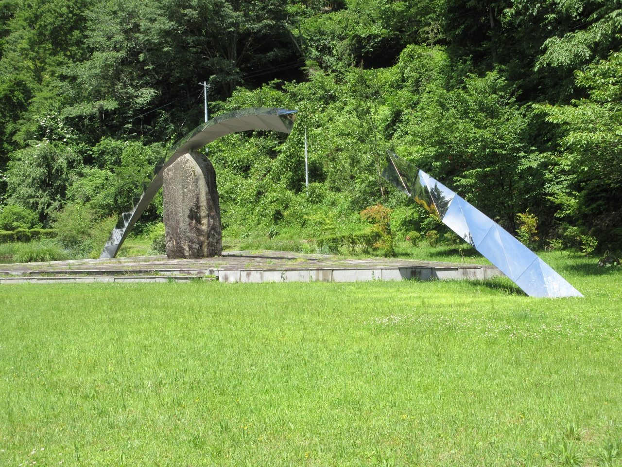 寝覚の床の川下にある公園です。寝覚の床の浦島伝説から時空をテーマにしたオブジェがあります。巨大な金属の日時計や石を組み合わせてアーチ型にした屋外彫刻などが草地にあります。遊具のない散歩する公園です。訪れた時、公園の草地は草が伸び放題で歩きにくかったです。ちょうど業者が来て草刈りを始めていたので夏にはもう少し歩きやすくなっているかもしれません。寝覚の床にはぽつぽつ訪れる人がいましたが、美術公園に来る人はいませんでした。知られていないのかもしれません。時空のオブジェを見に寄ってはいかがでしょうか。