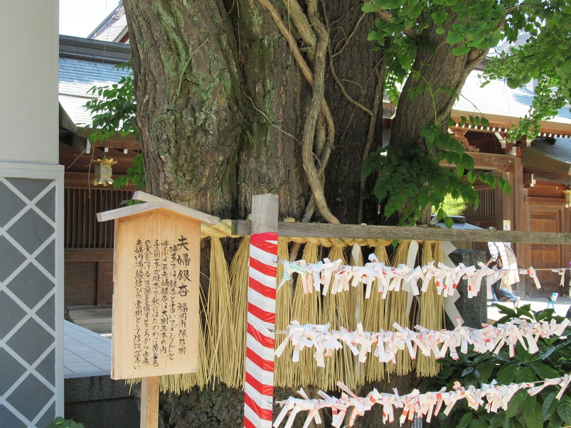 博多祇園山笠で有名な櫛田神社境内にある「夫婦銀杏」の巨老木。ご神木には直接触れることはできませんが見上げると巨木に包まれたような不思議な感覚を覚えました。樹齢1千年以上ということですが正確には不明のようですが福岡県天然記念物に指定されています。また石柱には櫛田の銀杏と刻まれていて筵が巻かれていました。威風堂々とした銀杏は神聖な気を感じます。