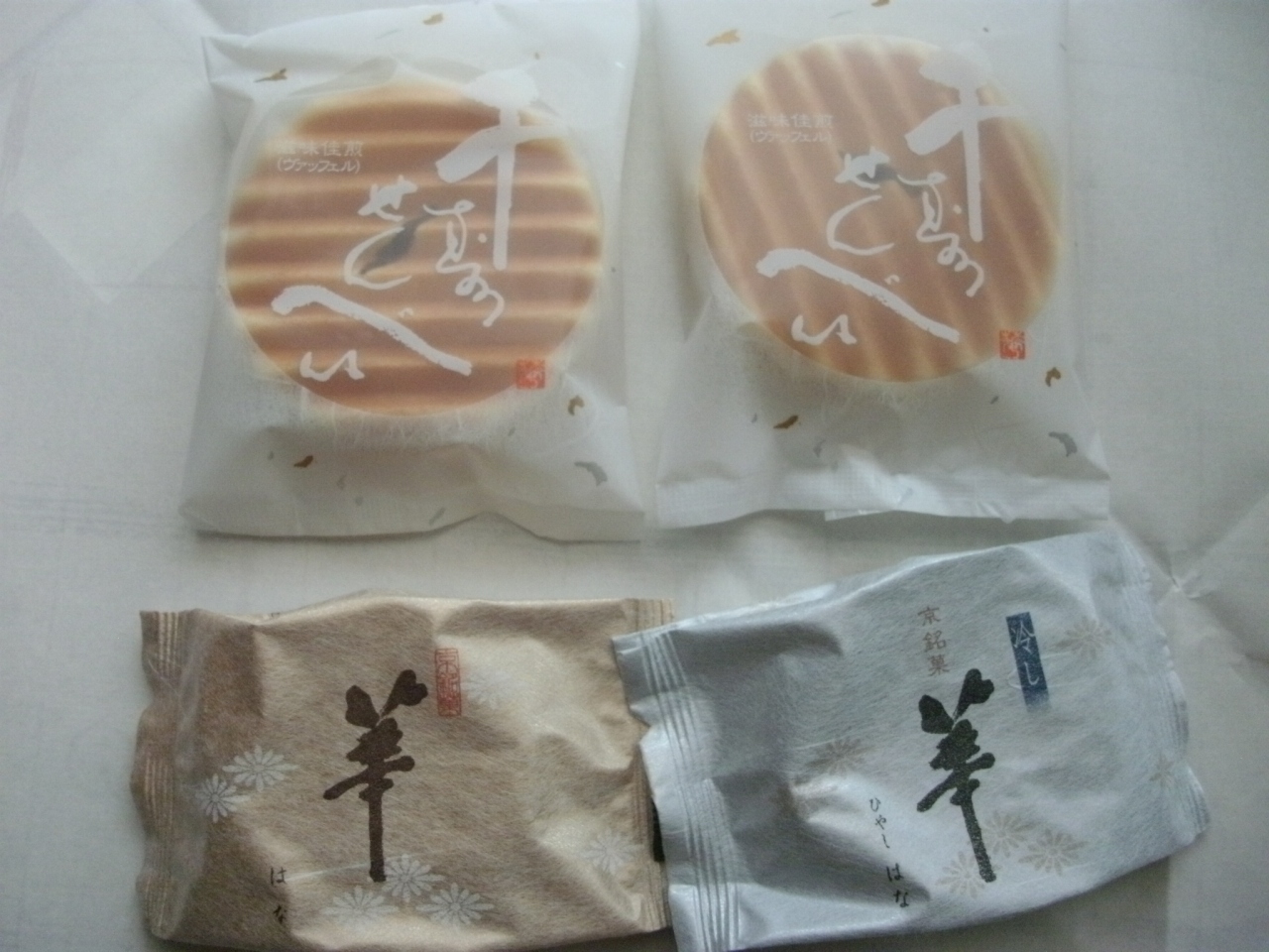 「鼓月」さんは、古くから京都に住んでいる人ならたいてい知っている菓子メーカー。中でもヴァッフェル生地にバニラクリームが入っている、波型のお菓子“千寿せんべい”は特に有名です。お店は老舗らしく大きな間口に風格ある構えで店内にはショーケースを中心にしてたくさんの商品が並んでいます。そんな中から、この日は“千寿せんべい”と“華”、“離宮”を購入しました。それぞれが個包装されているので、気に入った商品を必要なだけ購入できるし、お願いすれば化粧箱に詰めてもらえるので、ちょつとしたお使い物にもよい。贈っても喜ばれる商品がたくさんそろっています。
