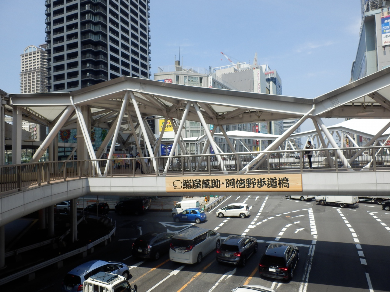 あべのロータリーに架かる陸橋、ここは大阪で二番目に交通機関が集まっている地域、JR大阪環状線、大和路線、阪和線、近鉄線、阪堺線、地下鉄御堂筋線、と交通機関が集積している、あべのハルカスへの入り口に接続、この陸橋はそれそれを結ぶ大役果たをしている様に見えるが移動する人の大半は陸橋に上がらず地下の連絡道へ向う、この橋は大阪市が募集して橋の命名権を持つ"鮨屋萬助阿倍野歩道橋"と呼ばれています