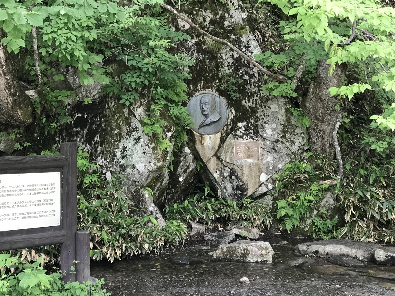 上高地始め、日本アルプスの山の魅力を世界に伝えたウォルター・ウェストンの記念碑。風景に溶け込んでしまい、うっかり素通りしてしまいそうです。ウォークガイドツアーなどに参加されると、嘉門次小屋の上條嘉門次が、ウォルター・ウェストンの山の案内人になったりなどを説明してくれ、この碑の意味が理解できます。