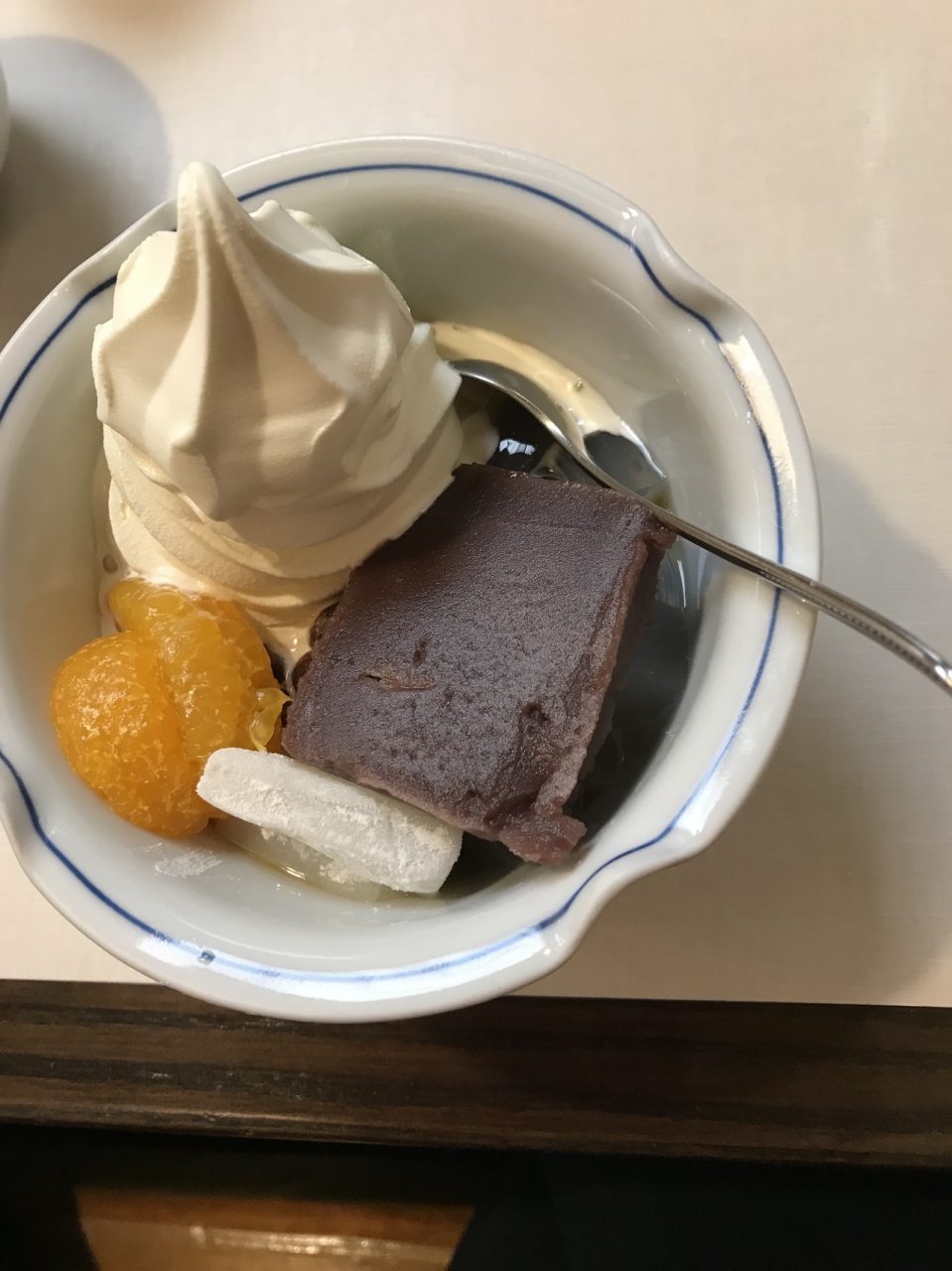 上野駅近くにあり、店前で、あんみつなどを買うこともできます。店内は、1階2階があり、テーブル席がほとんどです。並んでいることが多いです。様々な種類のあんみつ、こおりなどがあります。クリームあんみつは、ソフトクリームであんは、固まっていて、美味しいです。寒天も、程よい柔らかさで美味しかったです。